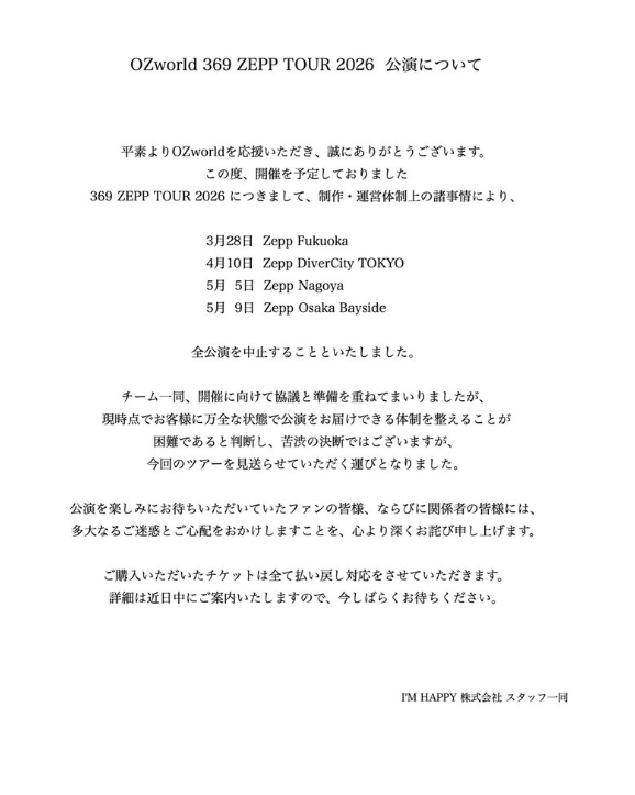 「369 ZEPP TOUR 2026」が全公演中止と発表。